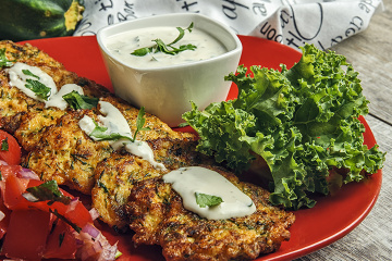 II śniadanie - Placuszki z oliwkami, porem, sałatką z pomidorów i sosem jogurtowo-ziołowym
