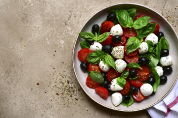 Kolacja - Sałatka z mini kulkami mozzarelli, czarnymi oliwkami, bazylią i pomidorkami koktajlowymi